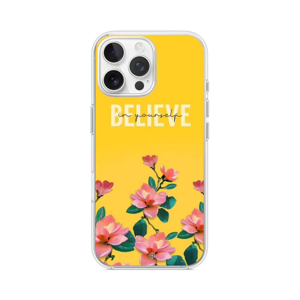 英文字入りオレンジ色背景の花柄 iPhone 16 Pro Max クリアケース