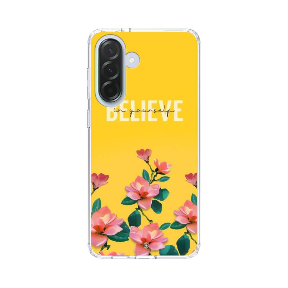 英文字入りオレンジ色背景の花柄 Samsung Galaxy A36 クリアケース