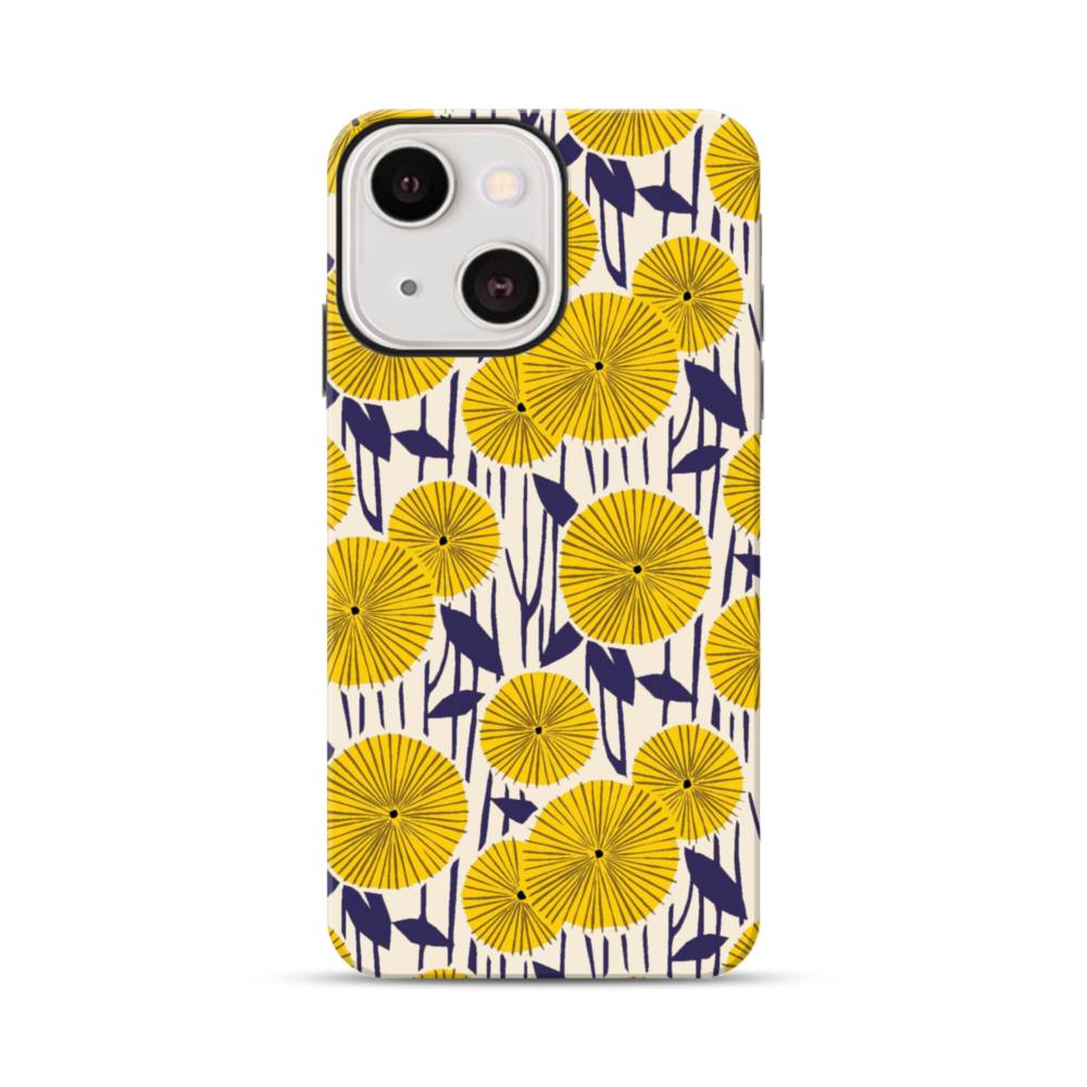 デザイン・花のモチーフ:黄色のひまわり&紺色の葉 iPhone 13 Mini タフケース