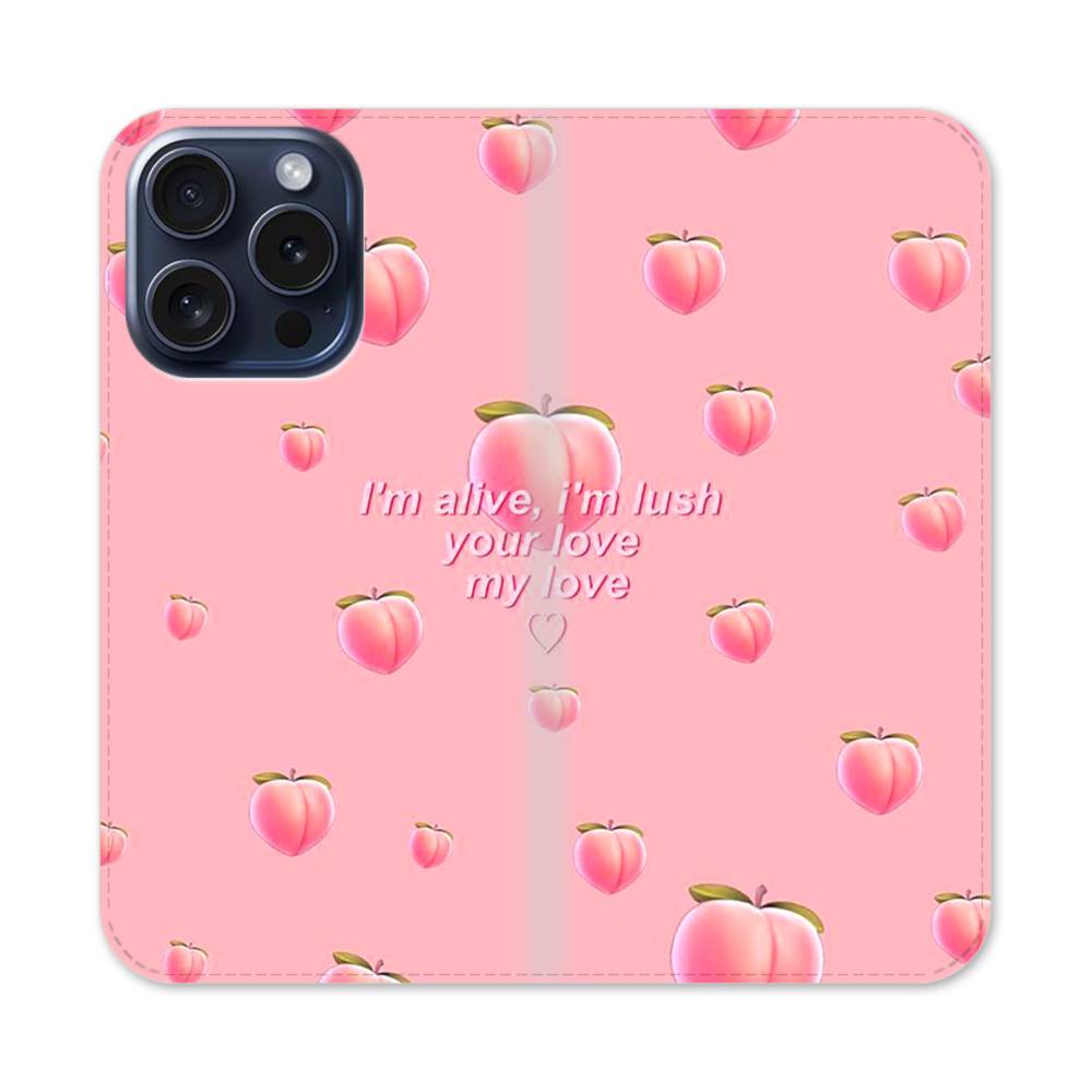英文字入り桃&桃色 iPhone 15 Pro 手帳型ケース