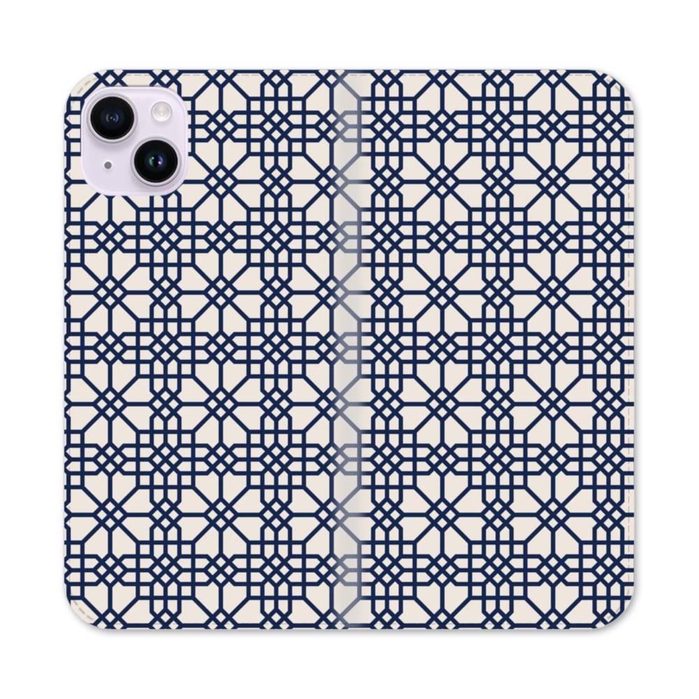 紺とピンクの幾何図パターン iPhone 14 Plus 手帳型ケース