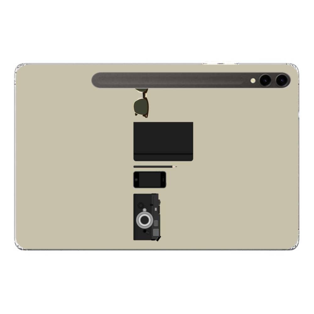 グレー ユニーク・アイテムのアート:サングラス、ノート、鉛筆& Samsung Galaxy Tab S9 Plus クリアケース