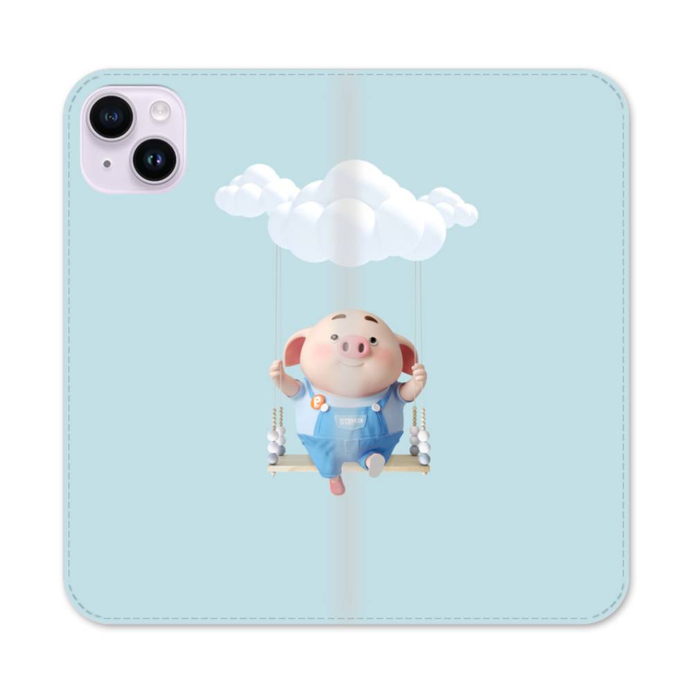 雲の下でブランコに乗ったコブタ iPhone 14 Plus 手帳型ケース