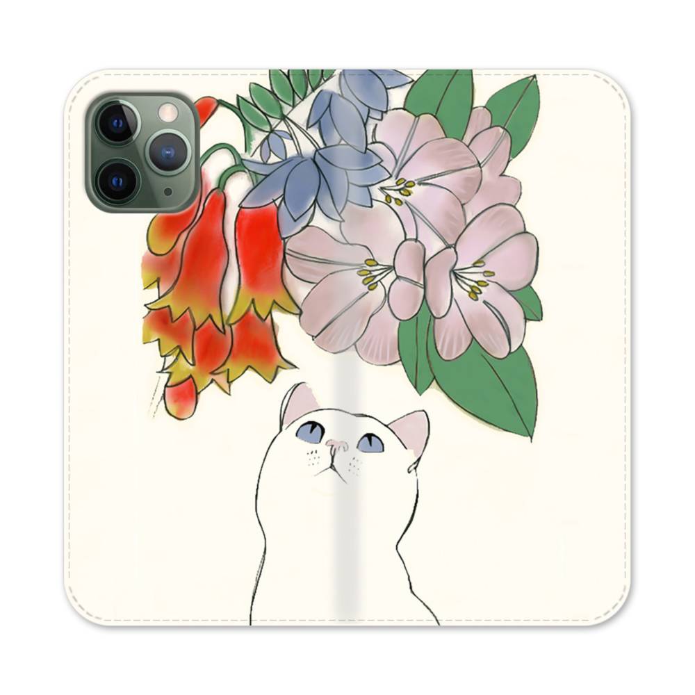 手書き風:猫&花 iPhone 11 Pro 手帳型ケース